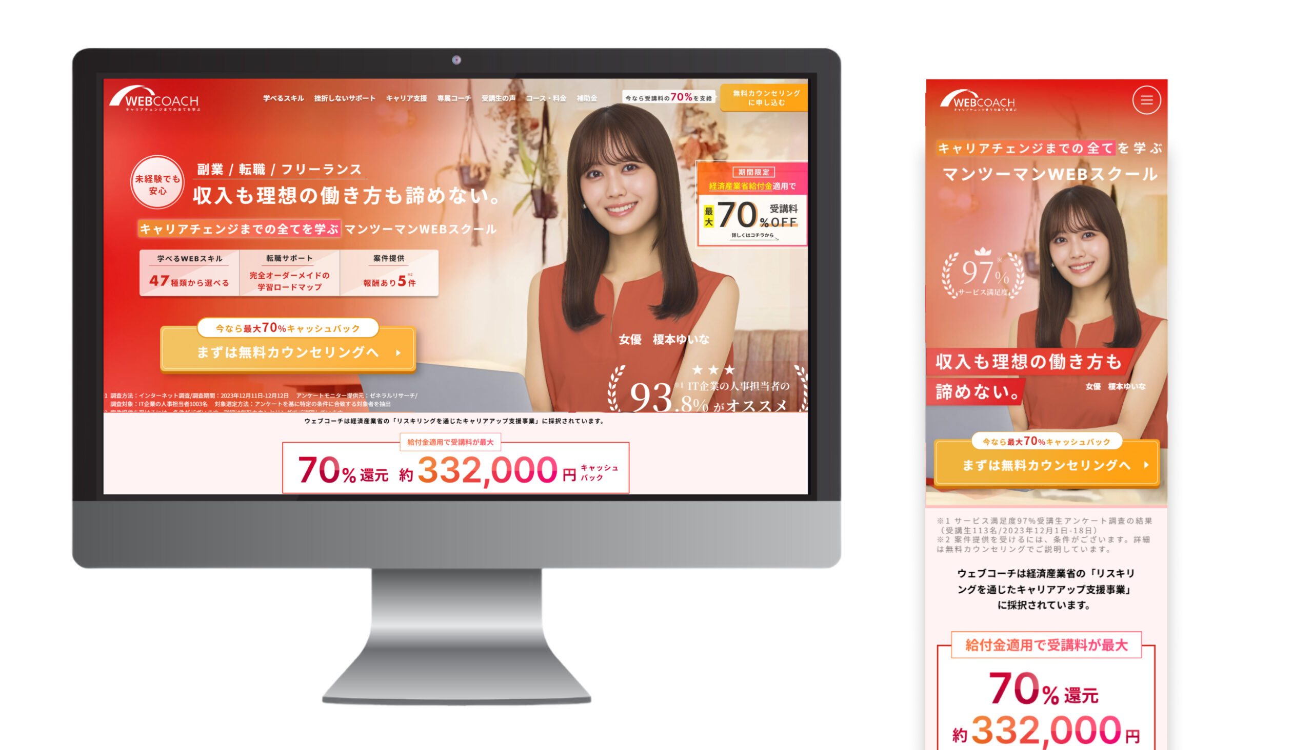 WEBCOACH は、 キャリアチェンジまでの全て を学び理想の”収入と働き方”、どちらも叶えるためのマンツーマンWEBスクール です。